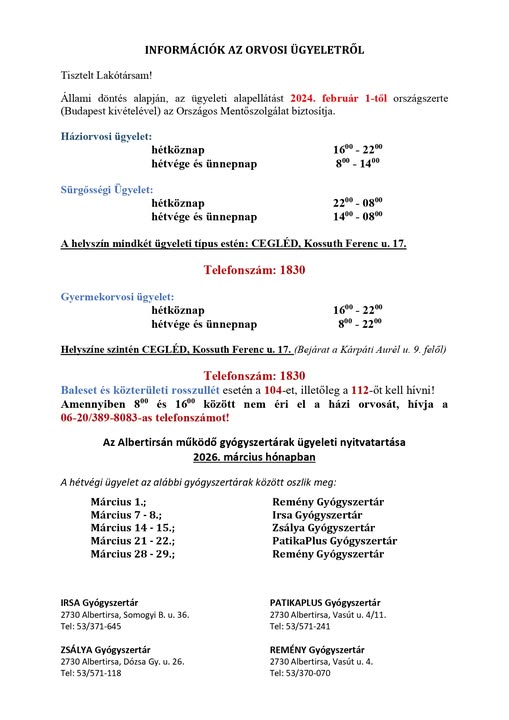 Ellátási körzet: Albertirsa, Dánszentmiklós, Mikebuda.